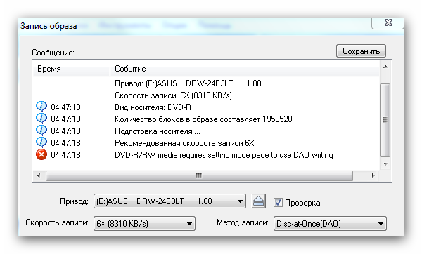 Если при попытке прожига выкидывает такую ошибку скорее всего Вам поможет решить проблему установка драйверов Intel Matrix Storage Manager (если конечно платформа интеловская, а скорее всего что так оно и есть...)