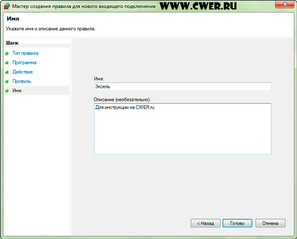 Мастер предложит создать имя (обязательно) и описание (необязательно) для создаваемого правила. После заполнения этой информации, нажимаем кнопку "Готово".
