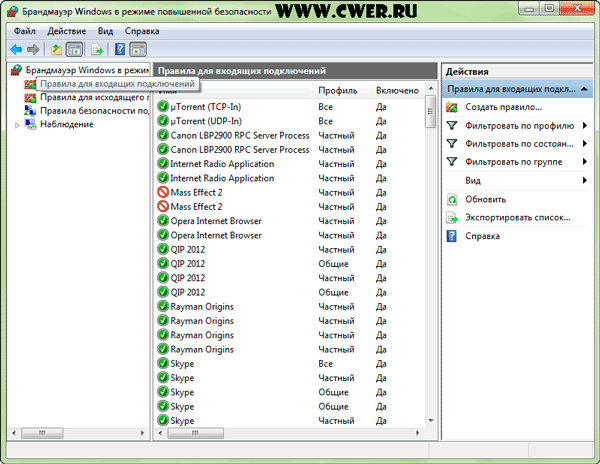 В открывшемся окне "Брандмауэр Windows в режиме повышенной безопасности" в левой колонке кликаем по пункту "Правила для входящих подключений".