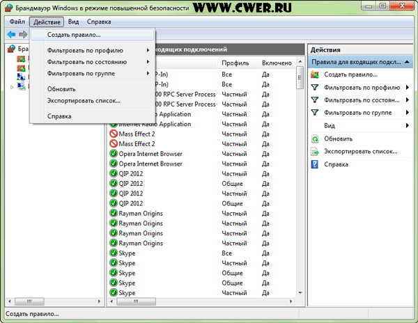 Далее в меню "Действие" необходимо выбрать пункт "Создать правило...". Будет запущен Мастер создания правила для нового входящего подключения.