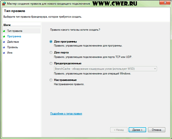 На вопрос "Правило какого типа вы хотите создать?" отвечаем "Для программы" и следуем Далее.