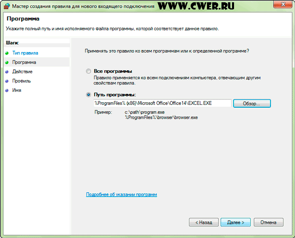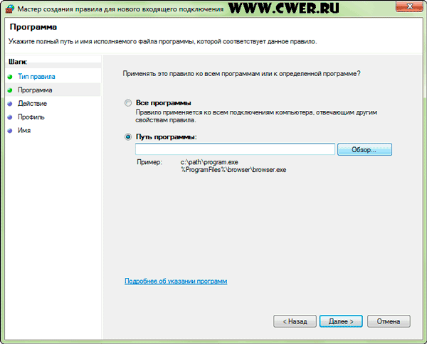 Так как нам нужно применить правило к совершенно конкретной программе, необходимо указать Путь к программе, нажав на кнопку Обзор.