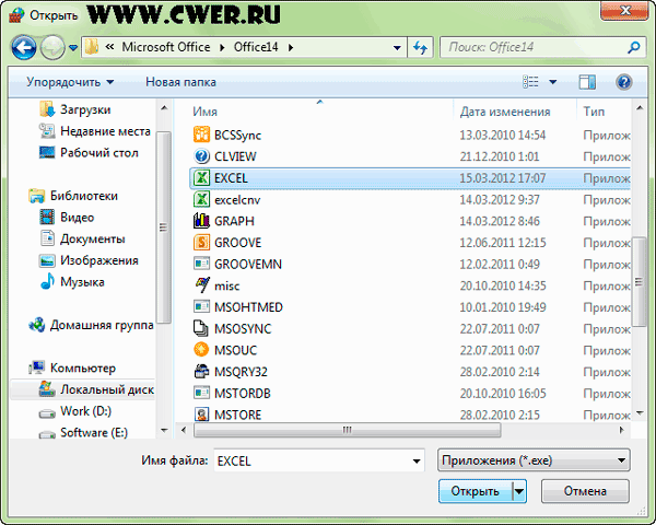 Указываем путь к исполняемому файлу программы (как было написано выше, в качестве примера мы выбрали Excel) и жмем на кнопку "Открыть".