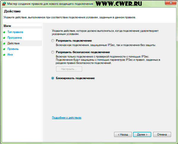 На этой стадии нам нужно обязательно из предложенных вариантов выбрать последний - "Блокировать подключение" и проследовать Далее.