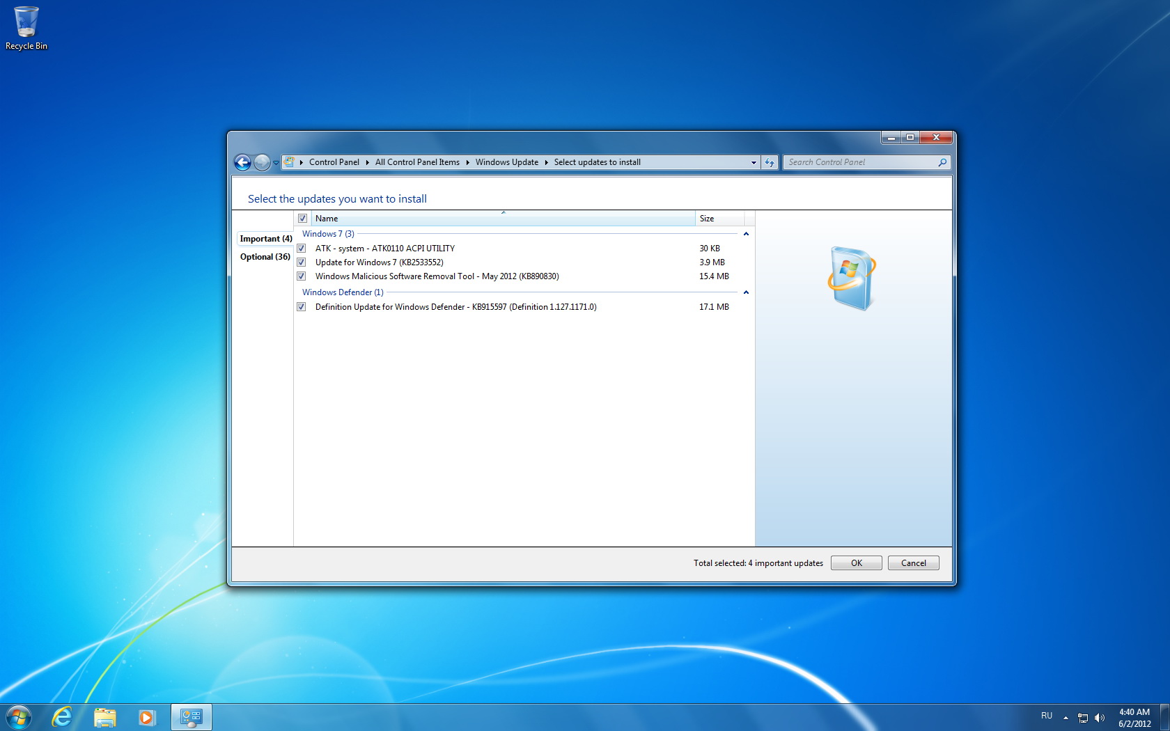 - Интегрированы все официальные обновления от Microsoft (кроме касающихся Windows Defeneder) по 01.06.2012