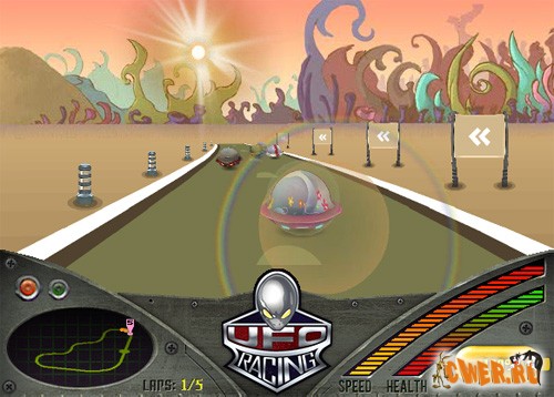 Весёлые флеш-гонки на летающих тарелках! В наличии различные трассы и пилоты.