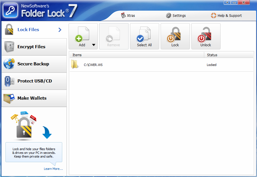 - True Ease of Use: Folder Lock 7 leverages NewSoftware's highly regarded graphical user interface. Existing Folder Lock users will be immediately productive: it's the same great console they already know and love. New users will find Folder Lock 7 remarkably easy to configure and use. Even relative novices can use all features of the product without going through all the jargon and how tos.
