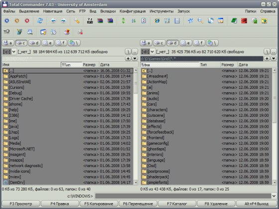Кроме всех функциональностей, характерных для файловых менеджеров, в Total Commander встроены очень удобные просмотрщики для мультимедиа и графических файлов, распаковщики ZIP, ARJ, LZH, RAR, UC2, TAR, GZ, CAB, ACE и дополнительные dll для других архивных файлов; встроенный ftp-клиент - вообще просто прелесть: можно скачивать/закачивать файлы в несколько потоков, есть докачка, поддержка www-прокси при работе с ftp и есть даже такая функция, как подключение-скачивание-отключение в заданное время к заданному ftp. Не будут лишними и такие функции, как UUE/MIME/XXE кодирование/декодирование и разрезка/склейка длинных файлов, а также множество других функций, крайне необходимых для работы с файлами.