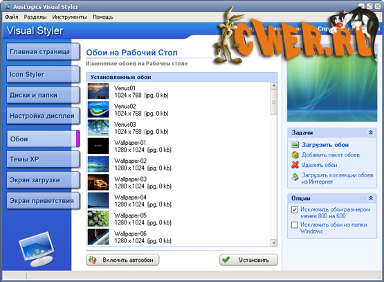 Преобразите свой Рабочий стол с помощью Visual Styler! Эта программа дает Вам шанс полностью изменить внешний вид Рабочего стола с помощью множества мощных инструментов. Забудьте про унылый выбор тем, что предоставляет Вам Windows, и разнообразьте внешний вид системы с помощью сотен новых тем, созданных другими людьми. Вы можете быть уверены, что найдете именно то, что вам нужно. С помощью простых и удобных средств вы сможете изменить более 80 системных и множество других иконок; использовать новые темы и стили для Windows XP, заменить скучный экран загрузки и настроить экран приветствия с помощью сотен тем, доступных теперь в интернете. Программа содержит другие интересные функции, такие как управления обоями, возможность создания своих пакетов иконок, автоматическая смена обоев при загрузке Windows и Мастер поиска элементов оформления с последующей автоматической установкой.