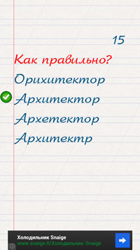 Ты тоже не знал, что "из-под мышек" пишется именно так? Тогда "Грамотей" удивит тебя ещё больше! Проверь свои знания с новой игрой "Грамотей", игрой для умных людей! В викторине собраны самые каверзные слова русского языка. Каждая игра состоит из 20 вопросов. Тебе дается 4 варианта написания непростого слова. Задача состоит в том, чтобы выбрать один правильный вариант. В конце игры ты получишь оценку своим знаниям: от 1 до 5+. Запоминай правописание слов и ставь рекорды! Повышение качества твоей орфографии и расширение кругозора гарантированы! В "Грамотея" можно играть одному, а можно устроить соревнование в большой компании и проверить, кто получит 5 в четверти! Проведите время весело и с пользой!
