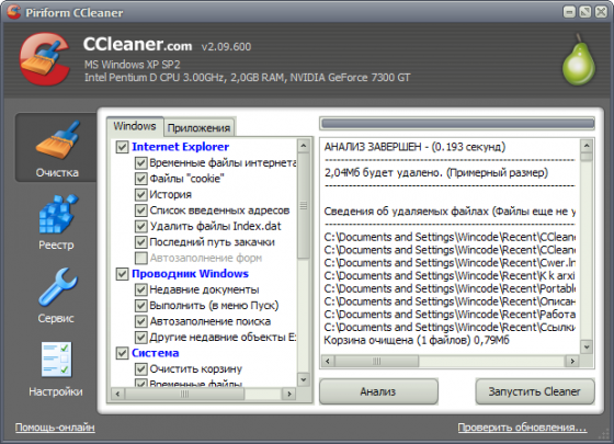 CCleaner, в зависимости от настроек, чистит следующие компоненты Windows: