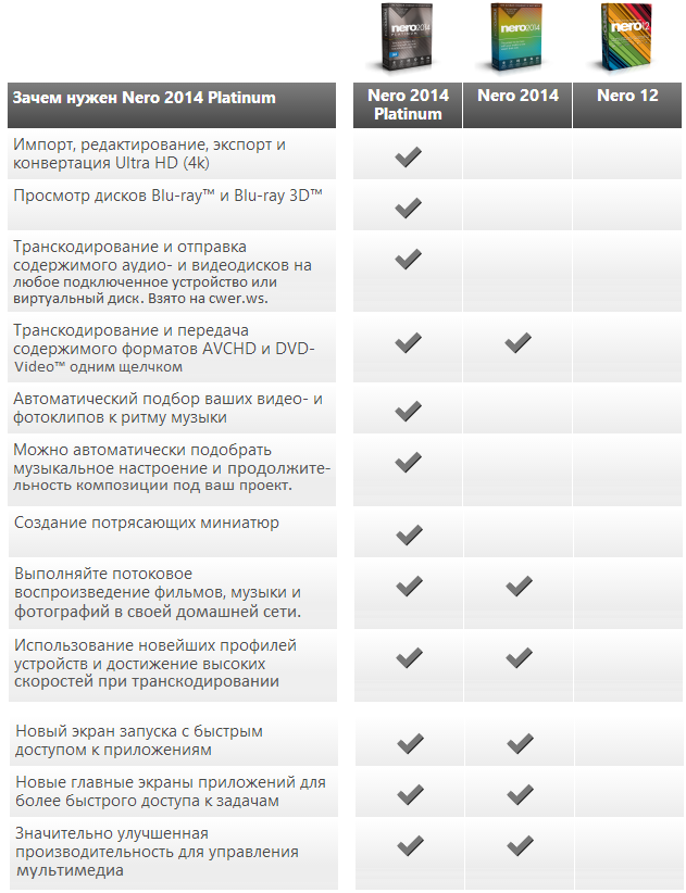 Nero 2014 предлагает целый набор полезных и простых в использовании инструментов, ориентированных на пользователей со специфическими задачами и разным уровнем подготовки. Начинающим придется по душе единая медиабиблиотека, предназначенная для централизованного управления цифровым контентом (аудиоматериалами, видеофайлами и фотоснимками), подготовки материалов и их распространения через Интернет. А специалисты по достоинству оценят доступные инструменты для редактирования мультимедийных данных и расширенную поддержку современных форматов, таких как Blu-ray. Приложение поддерживает импорт материалов с камер AVCHD и DSLR, смартфонов и другого оборудования, а также позволяет конвертировать видео для его последующего воспроизведения на устройствах XBOX 360, PS3/PS Vita, iPad, iPhone, Kindle Fire, планшетах и смартфонах Android и др.