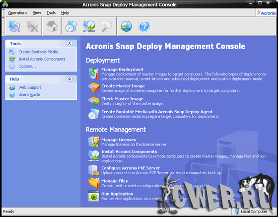 - Полная совместимость с Acronis Snap Deploy 2.0 и другими продуктами компании "Acronis" — Acronis Snap Deploy 3 для персональных компьютеров для персональных компьютеров позволяет развертывать образы дисков, созданные при помощи ASD 2.0 и Acronis True Image Echo.