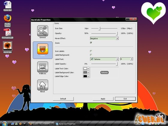 AuraCube - программа, изменяющая внешний вид рабочего стола Windows. Заменяет стандартные иконки рабочего стола на анимированные. Поддерживает помимо обычных еще и активные обои в виде внешних подключаемых модулей, с помощью которых возможен вывод 3D графики, Flash анимации, а также интерактивной информации.