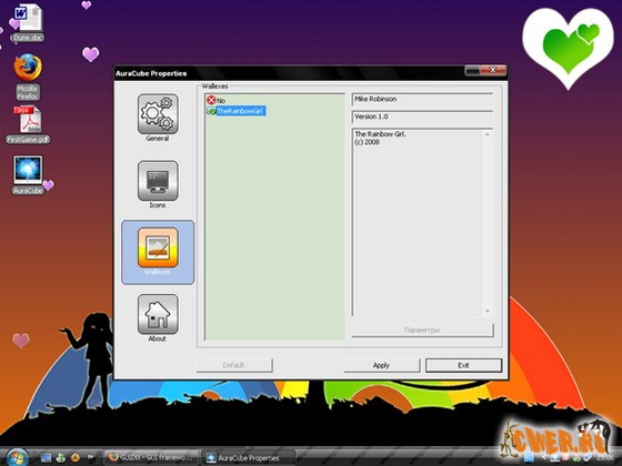 AuraCube is a program that allows users to have animated wallpaper on their Windows XP desktop. It supports 3D graphics as animated wallpaper, dynamically generated content as animated wallpaper, and more. The default setup includes two animated wallpapers, there are a beautiful girl with a rainbow and the planet Mars. More animated wallpapers will be available on the web-site soon.
