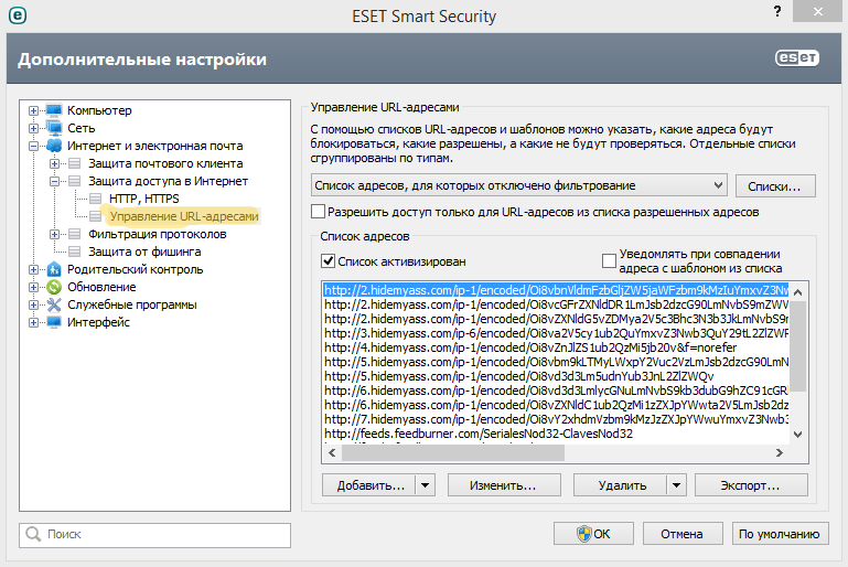 pps: адреса вводить тут - доп. настройки - Интернет и электронная почта - управление url - выбрать список адресов для которых отключено фильтрование