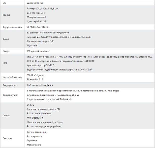 Планшет с операционной системой Windows 8.1 работает на процессоре Intel Haswell (Core i3, i5, i7). Кстати, на таких же CPU работает и ноутбук MacBook Air, который сама Microsoft называет главным конкурентами Surface Pro 3. А он выпущен около года назад.