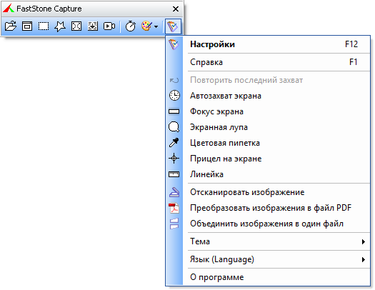 FastStone Capture – простая, но функциональная утилита для захвата снимков с рабочего стола Windows. Есть возможность захватывать как отдельные элементы (окна, части рабочего пространства), так и полный экран (поддерживается прокрутка страниц). Встроена панель для редактирования изображений, экранная лупа, пипетка и линейка, что делает программу ещё более удобной.