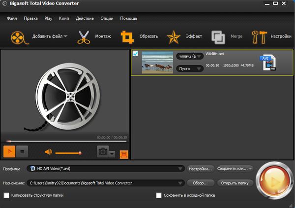 Bigasoft Total Video Converter - мощный видеоконвертер, позволяющий конвертировать практически любые видеофайлы в различные форматы. Программа распознает свыше 40 видео и аудио форматов и поддерживает конвертирование между свыше 30 форматами (HEVC/H.265, AVI, Xvid, DivX, H.264, MP4, 3GP, MKV, WMV, RM, FLV, MOV, WTV, MXF, MVI, F4V, Apple ProRes MOV, WebM, VP8, VP9, DAV, 720p, 1080p, 1080i HD, AVCHD видео и многими другими).