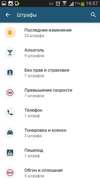 Удобный интерфейс приложения поможет быстро перейти к разделу, который необходим в той или иной ситуации. К примеру, раздел "Штраф" позволяет пользователю сразу найти нужную тему, а также узнать максимальный размер штрафа или меры, применяемые к нарушителю. Очень удобно то, что в приложении представлены все пункты КоАП, касающиеся штрафов. То есть, в случае спора с сотрудником ГИБДД, вы всегда сможете подтвердить свои слова документально, или попросить представителя закона найти соответствующий пункт в КоАП.