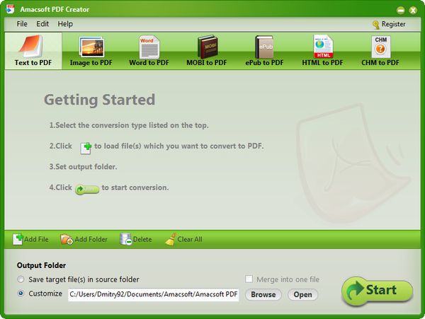 Amacsoft PDF Creator является лучшей программой для создания стандартных PDF файлов из различных популярных форматов файлов без потери качества. Программа позволяет создавать PDF документы из текстовых форматов, таких как Microsoft Word (.docx) и текст (.txt), основных форматов изображений, таких как JPG, PNG, GIF, BMP, из MOBI (.mobi, .prc), EPUB книг, HTML веб-страниц или файлов справки CHM.