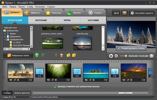 ФотоШОУ Pro - это удобная программа для создания музыкальных слайд-шоу с красивыми эффектами переходов, которую можно бесплатно скачать на cwer.ws. Позволяет добавлять неограниченное число фотографий, вставлять подписи и титры, использовать темы оформления и многое другое. Подготовленные слайд-шоу можно сохранить в виде EXE-файла, скринсейвера или видео, в том числе full HD.
