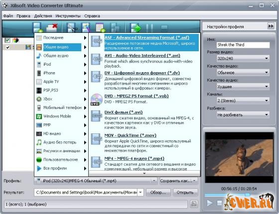 Xilisoft Video Converter Ultimate мощный, универсальный видео конвертер. Поддерживает большинство популярных видео форматов, в том числе DVD, VCD, SVCD, MOV, RM, AVI, MPEG, MPEG1, MPEG2, MPEG4, WMV, 3GP, h264 и т.д. Присутствует возможность конвертирования в iPod и PSP видео. Кроме того, Xilisoft Video Converter позволяет с легкостью извлекать аудио из видео с последующим конвертированием в MP2, MP3, AC3, RA, M4A, OGG, AAC и другие форматы. Поддержка h264, PSP MPEG4 AVC, пакетный режим конвертирования, предварительный просмотр в встроенном проигрывателе, выбор и настройка аудио и видео кодеков, настройка параметров конвертирования, простой и удобный интерфейс.