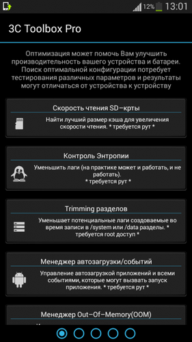 3C Toolbox Pro - это уникальное приложение, в котором присутствует полный набор инструментов для контроля и мониторинга любых android устройств. С помощью данного приложения вы сможете производить чистую перезагрузку, включать и отключать сетевые адаптеры, производить автоматическое резервное копирование установленных приложений, следить за состоянием системы при помощи виджетов на экране,просмотр SDcard, чтение данных ядра, диспетчер задач, закрытие приложений автоматически при нехватке памяти, настройка ЦП и другие полезные функции.