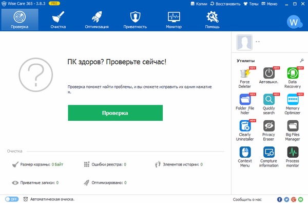 Wise Care 365 – программный пакет, предназначенный для оптимизации, настройки и очистки компьютера. Способен быстро и безопасно произвести очистку системного реестра, освободить место на диске, дефрагментировать реестр и жесткий диск, восстановить удаленные файлы, блокировать приложения путем установки пароля на запуск, оптимизировать оперативную память, редактировать список автозагружаемых приложений и многое другое. Имеются дополнительные опции скрытия и шифрования важных файлов или папок, оптимизация компьютера "в один клик" и работа по расписанию.