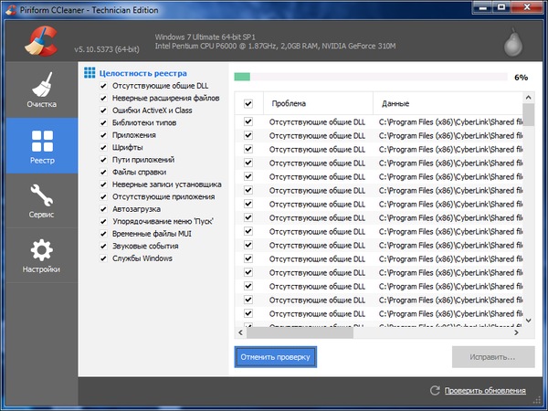 - Чистка и оптимизация реестра. Встроенный в программу чистильщик реестра позволяет проводить диагностику, выявляя проблемы и определяя неиспользуемые записи. Удаляются неиспользуемые расширения файлов, элементы управления ActiveX, ClassID, ProgID, общие библиотек DLL, ссылки на удаленные из системы шрифты, файлы справки, иконки, неверные ярлыки и многое другое.