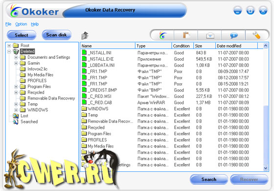 Программа Okoker Data Recovery создана для того, чтобы восстанавливать все удалённые файлы и папки. Эта программа позволяет тебе восстановить файлы, которые были удалены с корзины, так же как и те файлы, которые были удалены не через корзину (т.е. через Shift-Delete).