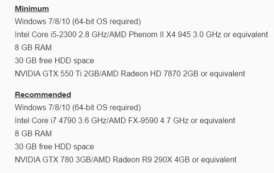 Рекомендованные требования к оборудованию выглядят так: процессор уровня Intel Core i7 4790 или AMD FX-9590 и видеокарта не хуже NVIDIA GTX 780 или AMD Radeon R9 290X. Для сравнения, авторы ролевой игры «Ведьмак 3: Дикая охота» назвали в качестве предпочтительной PC-конфигурации процессор Intel Core i7 3770 и видеокарту NVIDIA GeForce GTX 770.