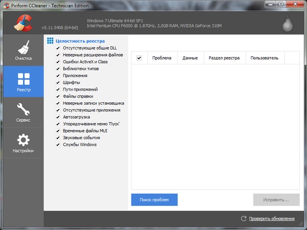 - Чистка и оптимизация реестра. Встроенный в программу чистильщик реестра позволяет проводить диагностику, выявляя проблемы и определяя неиспользуемые записи. Удаляются неиспользуемые расширения файлов, элементы управления ActiveX, ClassID, ProgID, общие библиотек DLL, ссылки на удаленные из системы шрифты, файлы справки, иконки, неверные ярлыки и многое другое.