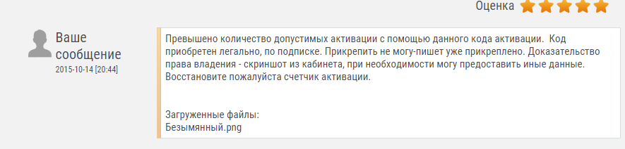 2015-10-15 15:50 минус 2015-10-14 20:44 = приблизительно 19 часов своей купленной лицензии я вынужден был сидеть без защиты от вирусов, по вине ..... создателей системы активации. Во-первых я мог заразиться за это время, во-вторых же это целый день лицензии был украден. Т.е получается этим днем я воспользоваться не смог. Т.е меня на день обокрали. Так и хочется сматюкнутся и спросить - вы ничего там не попутали, ..... ?