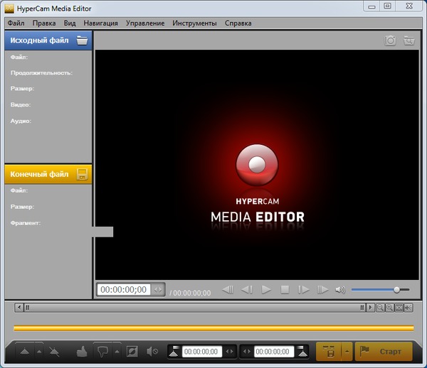 - Редактирование созданных файлов встроенным HyperCam Медиа Редактором c точностью до кадра (резка и склейка)
