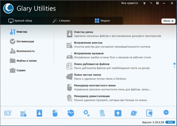 Glary Utilities – комплект системных твикеров и утилит для тонкой настройки, повышения производительности и защиты ПК. Позволяет избавиться от мусорных файлов, устаревших записей регистра и истории интернет-истории. При помощи Glary Utilities пользователь может управлять (в том числе и удалять) различными модулями, используемыми для расширения функциональных возможностей браузера, производить анализ эффективности использования дискового пространства и поиск существующих копий определенных файлов. Более того, Glary Utilities оптимизирует процесс использования системной памяти, осуществляет поиск, а также исправление или удаление неработающих ярлыков, редактирование списка программ, загружающихся вместе с операционной системой, и удаление указанных приложений. Также поддерживаются функции поиска пустых директорий и удаления файлов, без возможности их последующего восстановления.