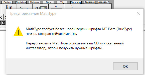 MathType требует более новой версии шрифта MT Extra (TrueType) чем та, которая сейчас имеется.