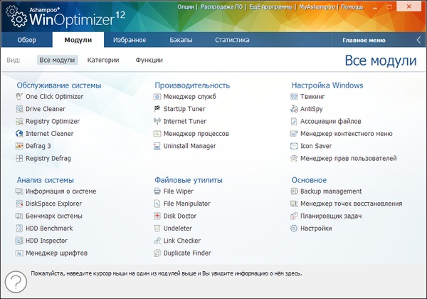 - Новый вид и улучшенное управление. Новая Ashampoo WinOptimizer 12 не только выглядит фантастически, но ещё и проще в использовании. Улучшенная навигация и возможности поиска делают работу более эффективной и интуитивной, так что Вы сможете достичь результатов быстрее.