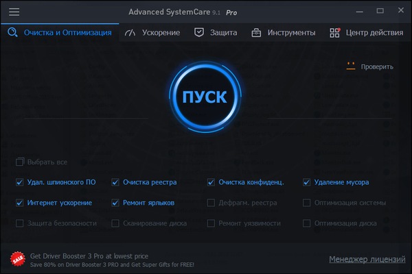 - Выполняет полный спектр работ для достижения наилучшей производительности. Простая очистка реестра не может обеспечить действительно серьезного увеличения скорости работы. Advanced SystemCare Pro совмещает очистку реестра, дефрагментацию, тонкую настройку системы, восстановление поврежденных ярлыков, удаление персональной информации из временных файлов, удаление ненужных файлов, восстановление и оптимизацию диска и многое другое – все, что требуется, чтобы ваш компьютер работал как новый.