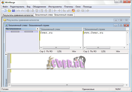 WinMerge - программа для визуального сравнения текстовых документов в Windows на предмет изменений в них. WinMerge умеет работать с DOS, UNIX и MAC форматами файлов, поддерживает Unicode и имеет подсветку синтаксиса. Может оказаться очень полезной, например, для определения того, что изменилось в одной версии проекта по сравнению с другой, а также для слияния изменений, выполненных в различных версиях. Кроме того, есть специальная панель для навигации по документу, при помощи которой можно быстро перемещаться к тем фрагментам файла, где есть отличия. Сравнение файлов можно выполнять с учетом регулярных выражений.