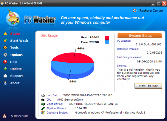 PC Washer - данная программа просканирует вашу систему и выдаст в процентном отношении её захламленность для принятия пользователем решения. Программе известно более 80 видов ненужных файлов, которые он готов удалить переместив их в корзину. PC Washer заставит вашу систему стать более устойчивой и работать быстрее, автоматически очищая ее от: временных интернет файлов и файлов оставленных программами; ненужных логов и файлов резервного копирования; пустых (нулевых) файлов; index.dat файлов; битых ярлыков; недействительных записей реестра и прочего ненужного мусора, так засоряющего вашу систему.
