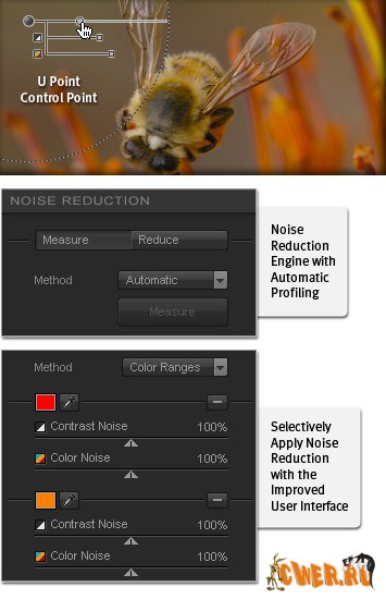 * Цветные Диапазоны: сокращает шум в пределах индивидуальных цветных диапазонов. Этот метод работает лучше всего при применении избирательного шумового подавления. Выборочно применяющееся шумовое подавление позволяет получить изображение с лучшими деталями и резкостью. Можно сохранить применяемые профили. В дополнение Dfine 2.0 предлагает три различных метода применения шумового подавления.