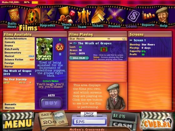 Нанимайте работников, выбирайте фильмы для показа в своих кинотеатрах, улучшайте закусочные, устанавливайте цены на билеты, заработайте деньги, чтобы покупать новинки синематографа! Все это Вы найдете во второй части игры Cinema Tycoon 2: Movie Mania.
