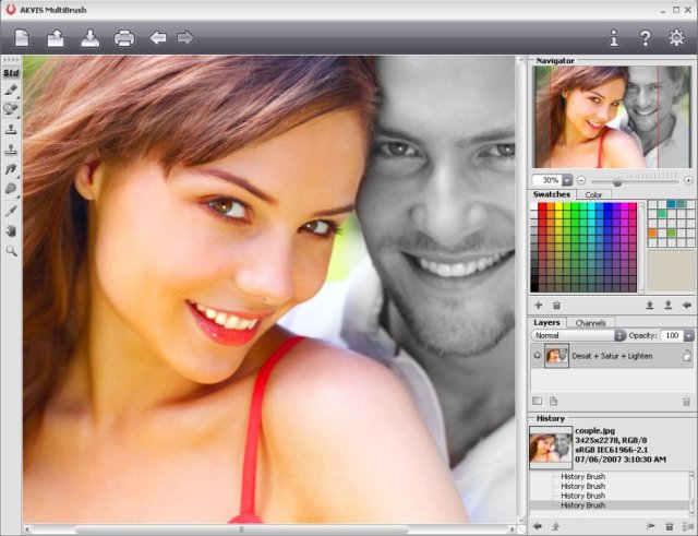 MultiBrush — отличный инструмент для ретуши фото и рисования картин, для удаления лишних элементов и добавления новых. MultiBrush позволяет исправить выбранные области фотоснимка: изменить насыщенность и резкость, высветлить или затемнить, удалить повреждения, извлечь лишнее и добавить новое.