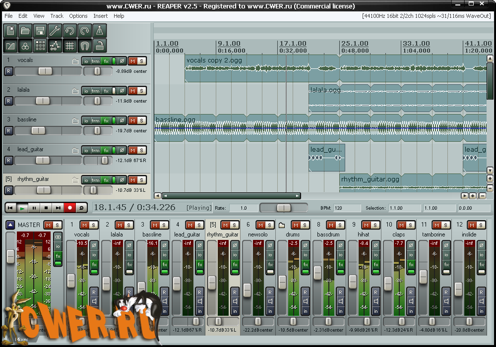 Это действительно полноценная рабочая студия. Из основных функций отмечу - поддержка неограниченного числа миди и аудиотреков (зависит от производительности системы), поддержка ASIO-драйверов, поддержка Direct-X и VST-плагинов и инструментов, поддержка миди-контроллеров, поддержка рендеринга с функцией рэсемплинга (встроенные алгоритмы), поддержка Rewire для синхронизации с Reason и другими программами. Из нестандартных функций хочу отметить ReaMote - инструмент для синхронизации с другими Reaper-ами по локальной сети. Также есть интересная функция визуализации (можно использовать плагины Winamp). Теперь будем пошагово разбирать основные ринципы работы.