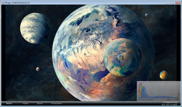 FastPictureViewer - просмотрщик графических файлов, основным достоинством которого является очень быстрая работа с файлами большого размера, и заключается в том, что программа использует не классические методы рендеринга изображений, а считывает их с помощью графического чипа видеокарты.