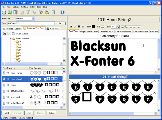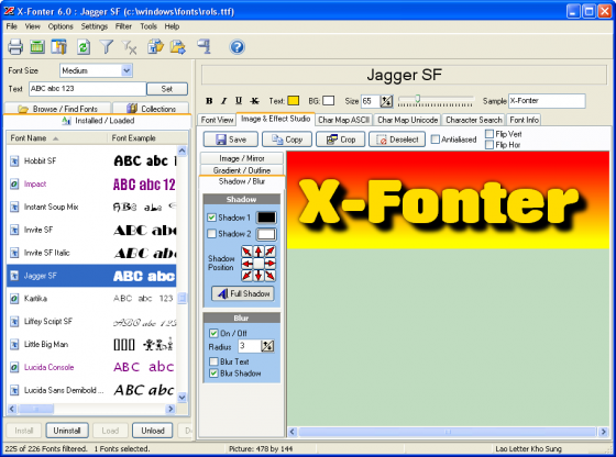 Редактор изображений имеет несколько неплохих эффектов, таких как тень, градиентные цвета, обводка и размытие изображений. Эта новая версия X-Fonter даст вам полный контроль и позволит управлять шрифтами, группируя их в коллекции по вашему усмотрению. B не имеет значения кто вы - новичок или профессионал, с X-Fonter вы сделаете свою работу одинакого хорошо.