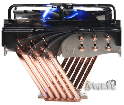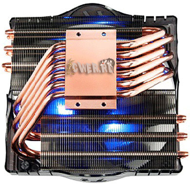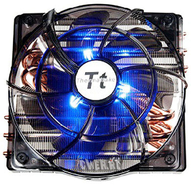 Конструктивно изделие весом 800 г состоит из отполированного до зеркального блеска медного основания, от которого в двух направлениях отходят по шесть медных тепловых трубок толщиной 6 мм, пронизывающих две секции массивного алюминиевого радиатора с 69 тонкими пластинами каждая. На самом радиаторе, имеющем габариты 156 x 155 x 128 мм, установлен рассчитанный на 50000 часов безотказной работы вентилятор типоразмера 140 х 140 х 30 мм с эффектной голубой светодиодной подсветкой. При этом скорость его вращения можно регулировать при помощи специального переключателя VR Fan Knob в диапазоне от 1000 до 1600 оборотов в минуту. Примечательно и то, что в запущенном состоянии "пропеллер" перекачивает до 85,76 кубических футов воздуха в минуту, тогда как уровень создаваемого им шума находится в пределах от 16 до 24 дБ.