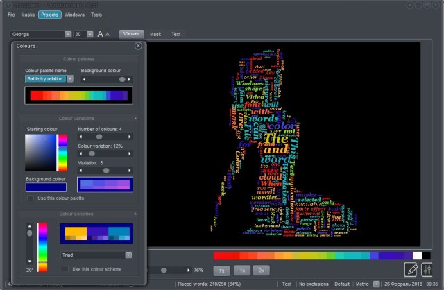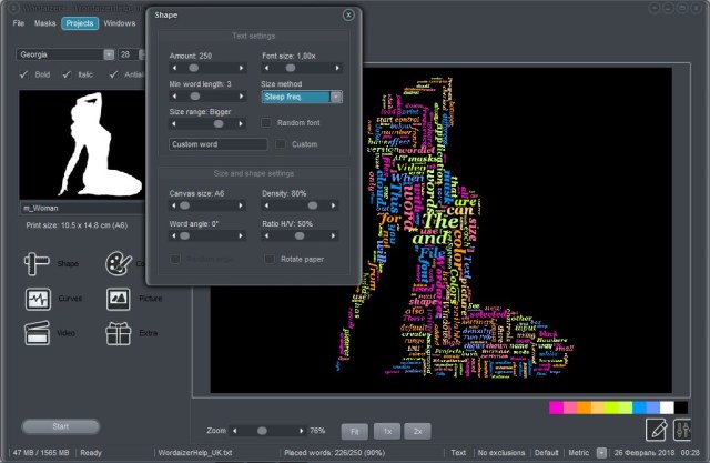 Wordaizer — графический редактор, который позволяет создавать изображения из набора слов. Вы можете сами задать нужные слова, или выбрать текстовый документ и оттуда автоматически будут собраны наиболее часто используемые слова. После этого Вы получите рисунок из слов. Благодаря встроенным фигурам можно выбрать нужную вам или создать свою, а можно просто показать рисунок программе и на его основе будут собраны слова.