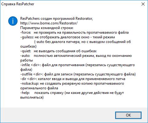 - Поддержка командной строки. С параметрами командной строки Вы можете без труда запускать Restorator из пакетной программы для автоматизированного выполнения. Также возможно включить Restorator или ResPatch в инсталляционные программы (типа InstallShield), чтобы автоматизировать внесение исправлений в ресурсы в процессе инсталляции.